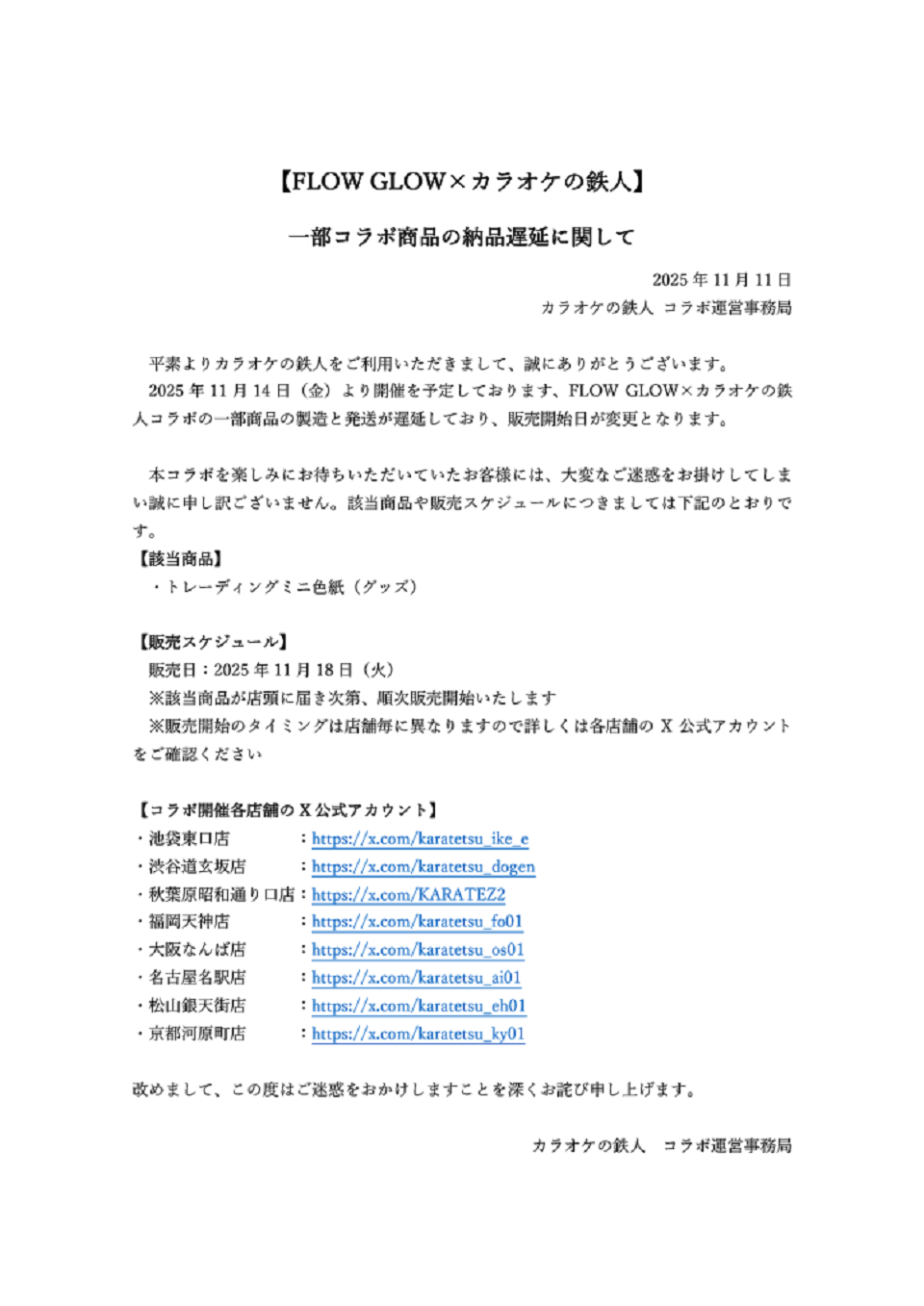 | 販売店舗 | カラオケの鉄人 池袋東口店 / 渋谷道玄坂店 / 秋葉原昭和通り口店 / 福岡天神店 / 大阪なんば店 / 名古屋名駅店 / 松山銀天街店 / 京都河原町店 |