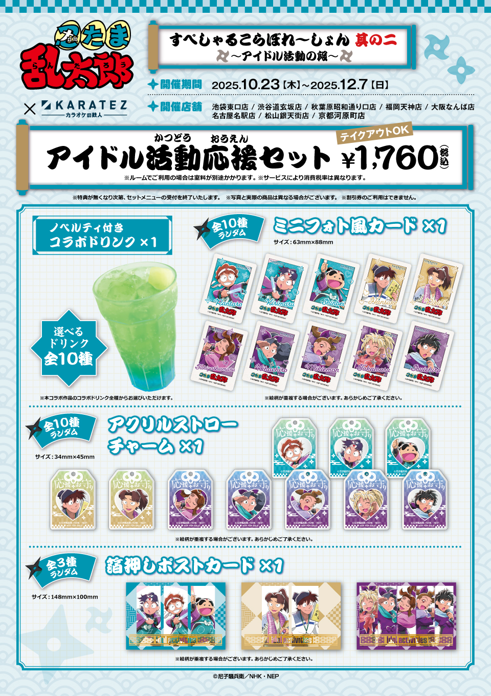 開催店舗 | カラオケの鉄人 池袋東口店 / 渋谷道玄坂店 / 秋葉原昭和通り口店 / 福岡天神店 / 大阪なんば店 / 名古屋名駅店 / 松山銀天街店 / 京都河原町店 ※福岡天神店『ROOM.4』、名古屋名駅店、松山銀天街店『ROOM.2』は~11月23(日)までの実施となります。 |