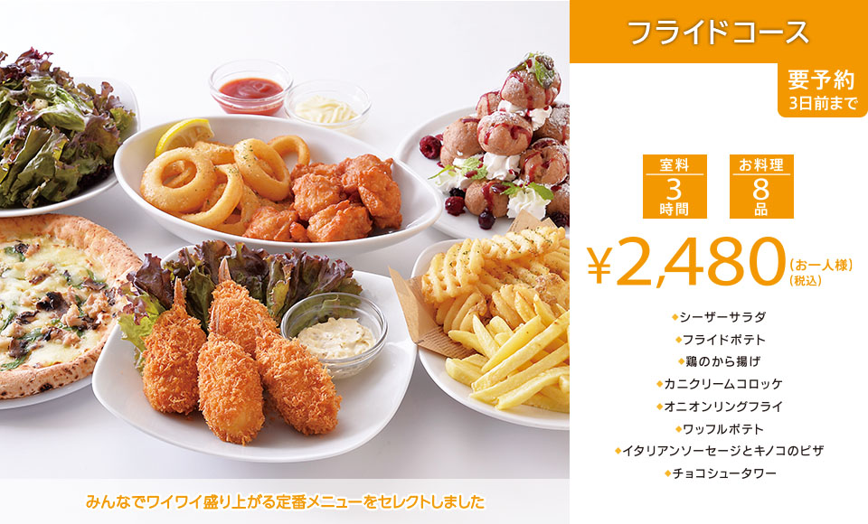 ※パーティーコースは、4名様以上でご利用いただけます※ワンドリンクオーダー制または飲み放題コースをお選びいただきます※写真はイメージです※店舗により使用している食器や盛り付けが写真と異なる場合がございます※天候などの仕入れ状況により、使用する食材が変更になる場合がございます※当店使用の米はすべて国産米です※小学生以下のお客様への料理の提供はございません※料理をご希望の場合は、通常料金にて承ります